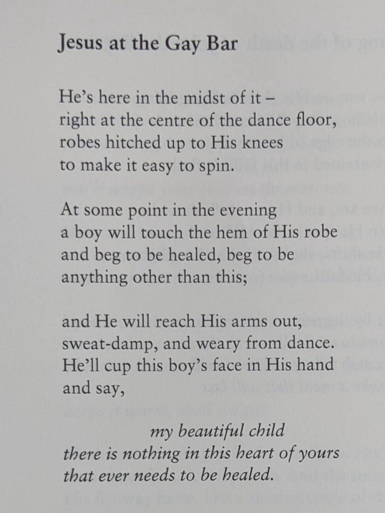 Jesus at a Gay Bar Posted on November 21, 2022 by Timothy Brown By Jay Hulme. Literally, the best poem I’ve read this Fall on the subject. Share this: Click to email a link to a friend (Opens in new window) Email Click to print (Opens in new window) Print Click to share on Facebook (Opens in new window) Facebook Click to share on X (Opens in new window) X Like Loading... Related