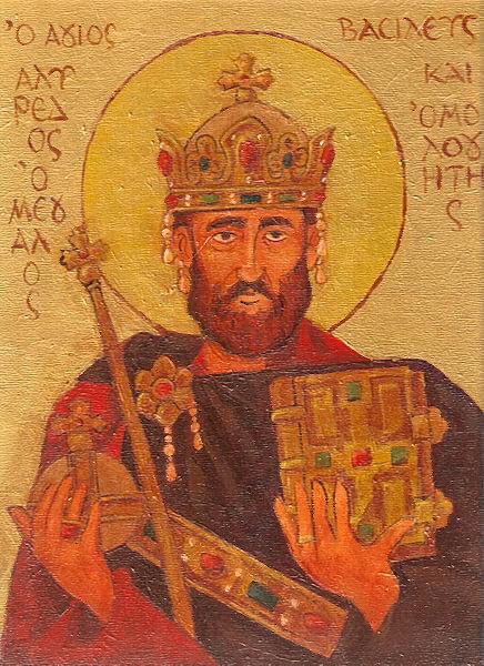 Born the youngest of five sons to Kin Aethelwulf in 849 CE, King Alfred assumed the throne of the West Saxons after his father and all four of his brothers died, one after another, in short order. In these days the Danish tribes were wreaking havoc on Wessex, and Saint Alfred was able to protect his people and drive the warring tribes off the island.